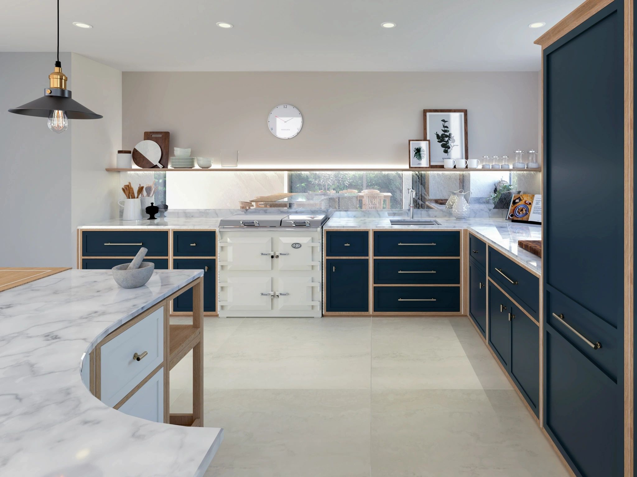 An in-frame kitchen style with expressed natural wood features.